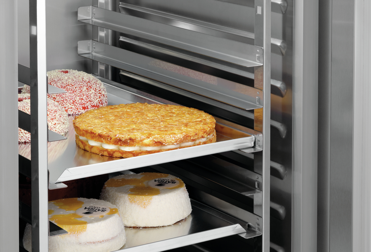 Kuchen und Torten, Brot und Brötchen vorproduzieren und bis zur Ausgabe oder Weiterverarbeitung auf dem passenden Blech fachgerecht kühlen und lagern. Der Kühlschrank im Bäckereinorm-Format schafft hierfür ausreichend Platz in Bäckereien, Konditoreien, Cafés sowie Hotelküchen.