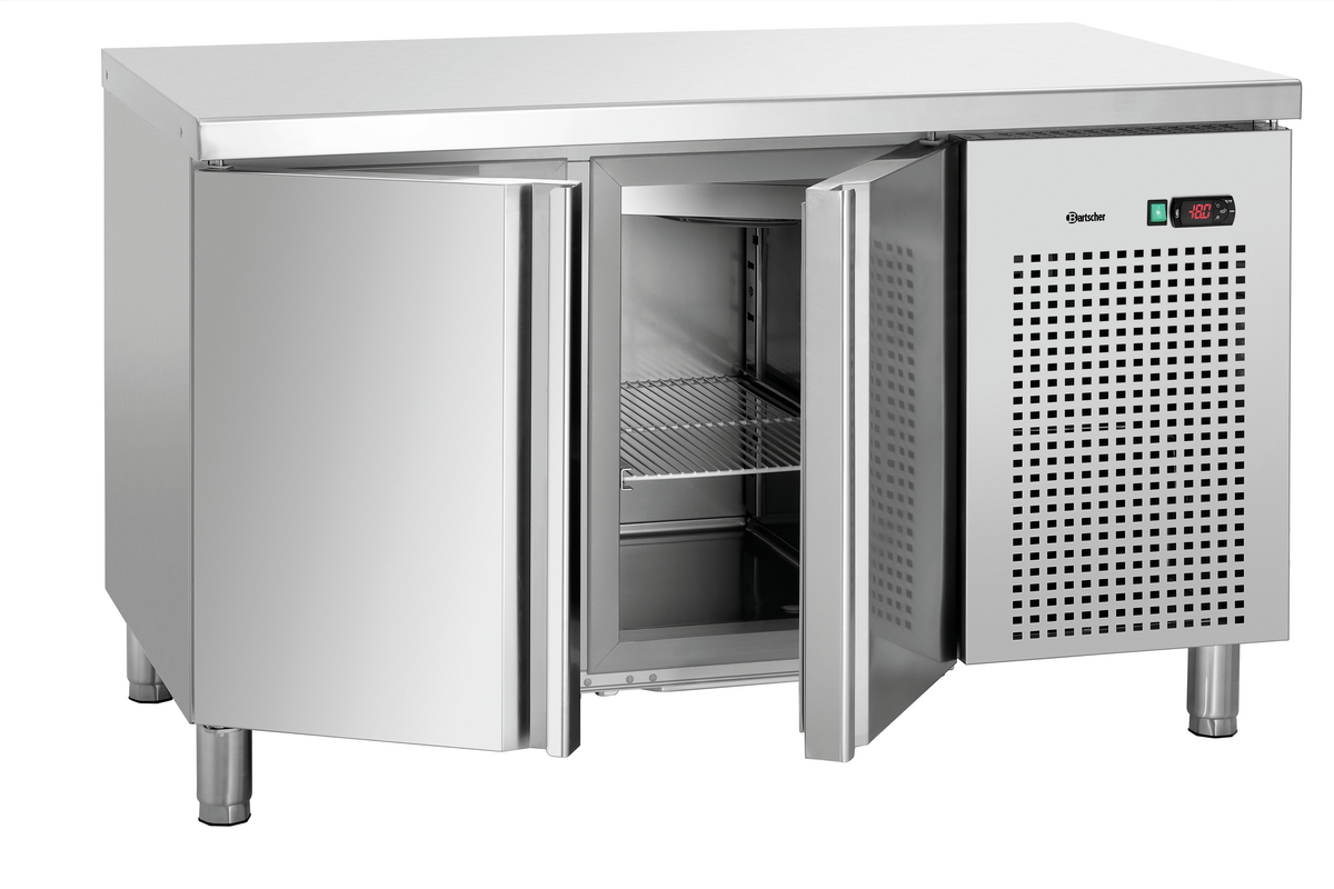 Der 2-türige Tiefkühltisch mit hochwertiger Edelstahl-Arbeitsfläche bietet geräumigen und leicht zugängigen Platz für Tiefkühlwaren. Dank der Umluftkühlung hält er konstant und gleichmäßig die Temperatur – ein zuverlässiger Partner in der Küche.