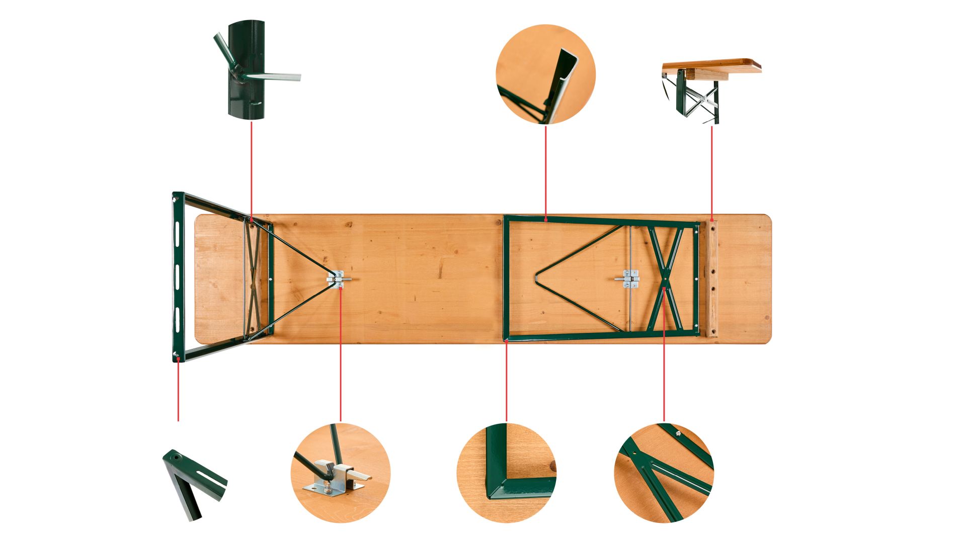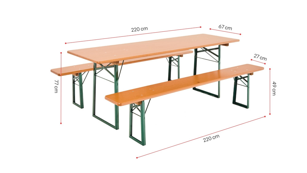 Ganz klassisch und doch besonders. Die 3-teilige Bierzeltgarnitur besteht aus einem Biertisch und zwei Bierbänken – allesamt sind aus Fichte und mit einklappbaren Metallbeinen für den schnellen Auf- und Abbau versehen. Der 67 cm breite Biertisch bietet ausreichend Platz, auch wenn sich Ihre Gäste gegenüber sitzen. Die 27 cm breite Bierbank gewährt Ihren Gästen etwas mehr Sitzfläche als gewöhnliche Bierzeltgarnituren und verleiht ihnen so mehr Komfort.