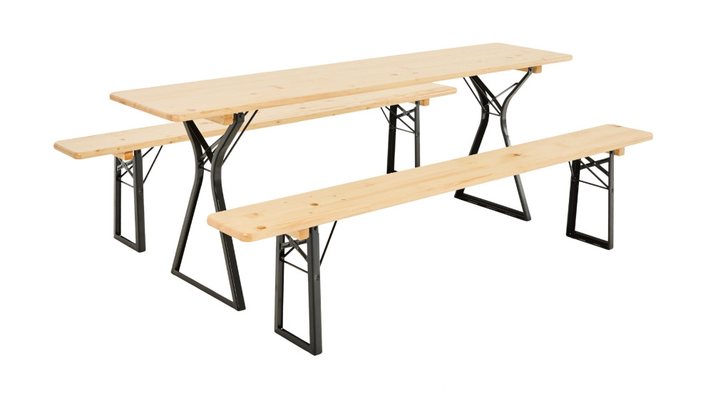 Durch die witterungsbeständige Lasur ist die Bierzeltgarnitur mit Beinfreiheit gleichermaßen für den Innen- wie den Außenbereich geeignet.!