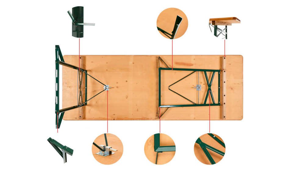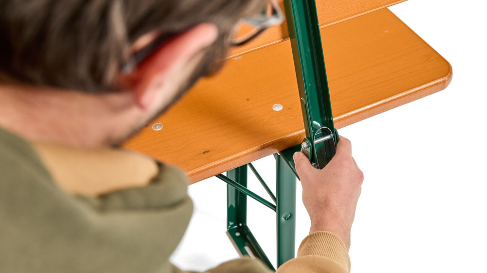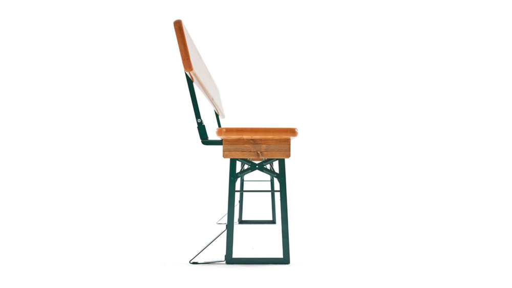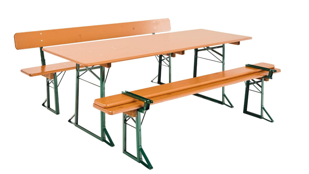 Die breite Bierzeltgarnitur mit Rückenlehne ist der Inbegriff für eine komfortable Bierzeltgarnitur. Der extra breite Biertisch in Kombination mit den zwei Bierbänken, die um klappbare Lehnen ergänzt und kinderleicht bedienbar sind, sorgen für den besonderen Festzeltgarnitur-Komfort im Vergleich zu einer klassischen Bierzeltgarnitur. Die Lehne garantiert dabei mit ihrer ergonomisch optimierten Lehnenneigung ein angenehmes Sitzen. Dazu trägt natürlich auch die etwas breitere Sitzfläche bei. Zudem wird eine jede Bierbank mit Lehne standardmäßig mit einer zusätzlichen Verlängerung an der Hinterseite des Untergestelles geliefert. Dies erhöht die Stabilität der Bierbank und beugt so einem Umkippen der Bank vor.