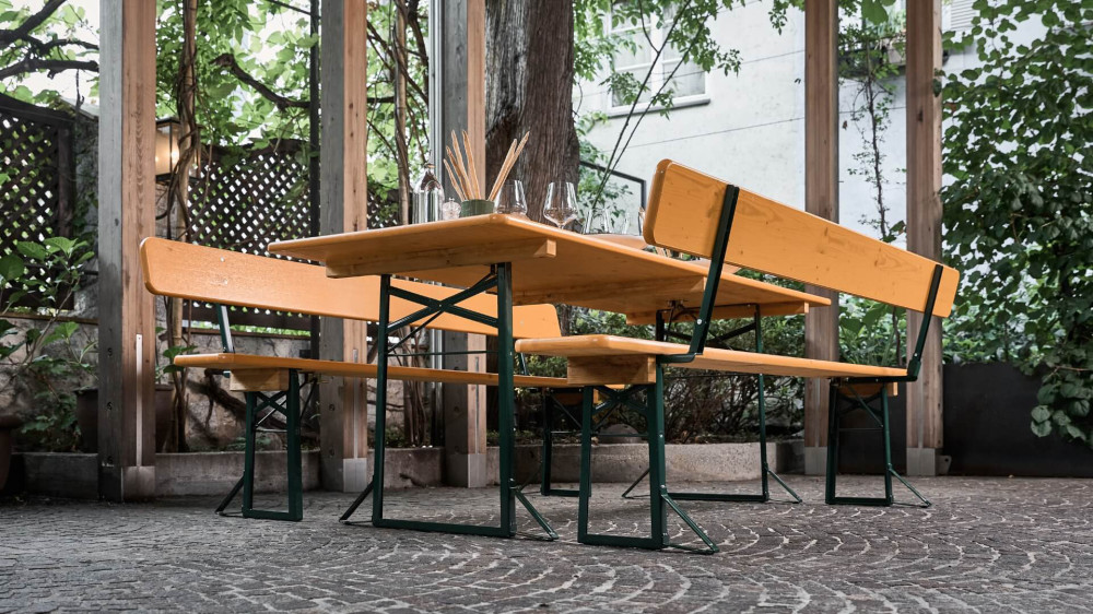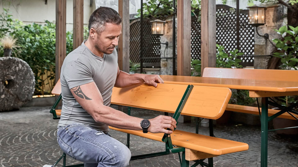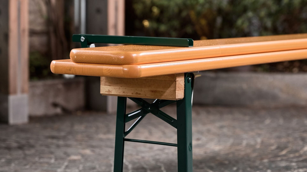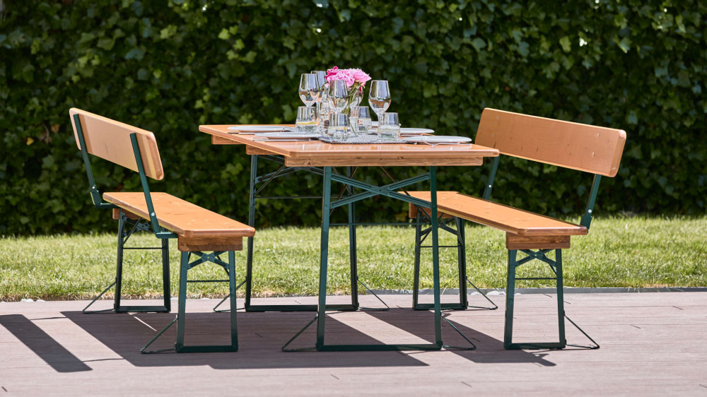 Durch die witterungsbeständige Lasur ist die breite Bierzeltgarnitur gleichermaßen für den Innen- wie den Außenbereich geeignet.