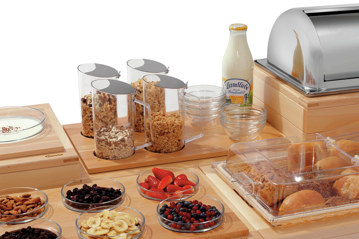 Mit dem modularen Set im schlichten Holzdesign wirkt jedes Buffet ansprechend strukturiert und aufgeräumt. Ob bei Frühstück-Buffets oder Brunchs können die 4 Karaffen mit verschiedensten Cerealien bestückt und auch ganz einfach ausgetauscht oder nachgefüllt werden. Die praktische Abstellfläche bietet Platz für beispielsweise Müsli-Schälchen.