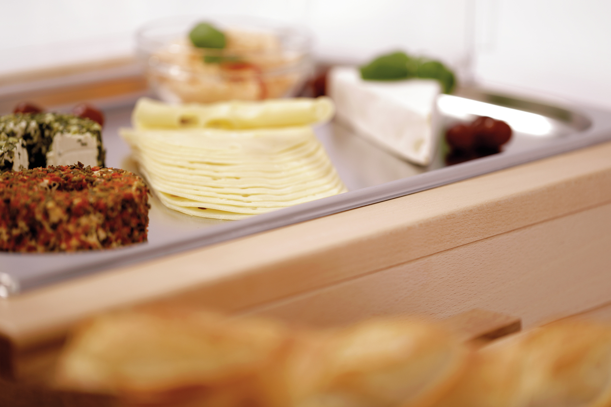 Mit dem modularen Set im schlichten Holzdesign wirkt jedes Buffet ansprechend strukturiert und aufgeräumt. Ob bei Frühstück-, Mittag- oder Abend-Buffets kann die Kühlplatte beispielsweise mit Aufschnitt, Käse, Fisch oder Obst bestückt und auch ganz einfach ausgetauscht oder nachgefüllt werden.