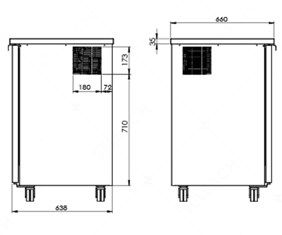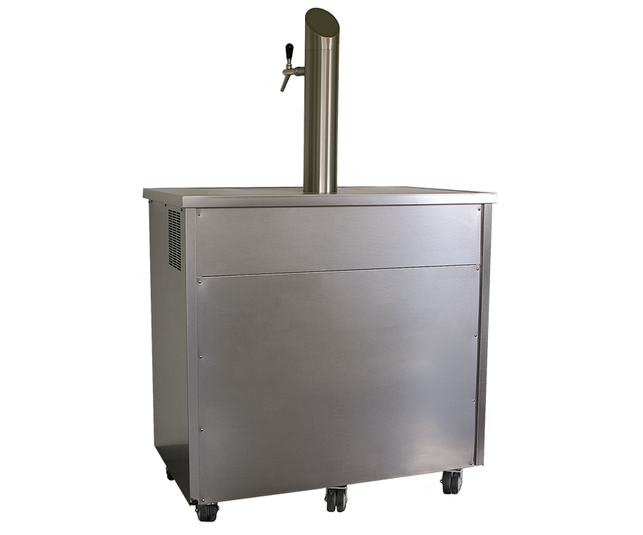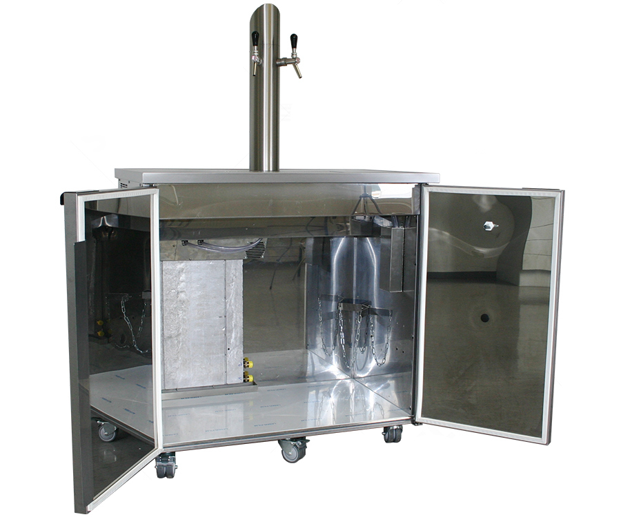 Mobiles Schanksystem mit Kühlraum auf Rollen, eingelassene Tropfschale in der Abdeckung, 2-leitig, 7 i.D., montierte Towersäule mit 2 Junior-Metallkompensatorhähnen, Trockenkühlung (3/8 PS), verschlaucht und inkl. Druckminderer Kombination von Raum- und Durchlaufkühlung, für 2 Bierfässer