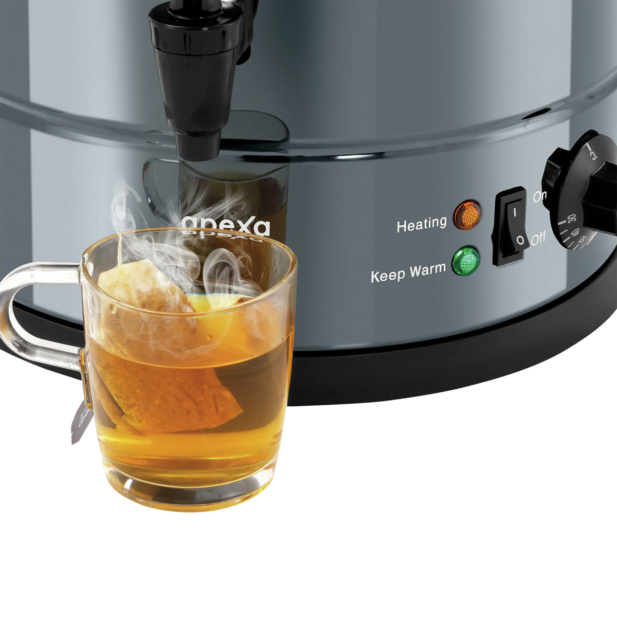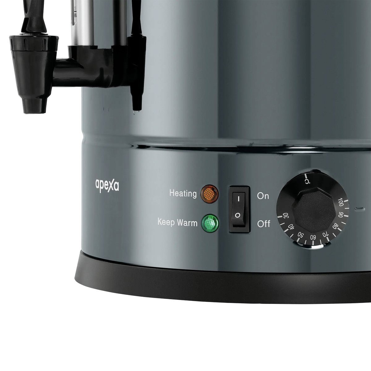 Der Heißwasserspender kocht bis zu 30 Liter Wasser auf und hält sie stundenlang warm. Über die Füllstandsanzeige kann der Wasserstand ganz einfach abgelesen werden. Die praktischen Griffe am Heißwasserspender ermöglichen ein leichtes Transportieren von A nach B. Das schwarze Design des Heißwasserspenders integriert sich in alle möglichen Stilrichtungen und verleiht jedem Selbstbedienungsbereich eine edle und moderne Note.