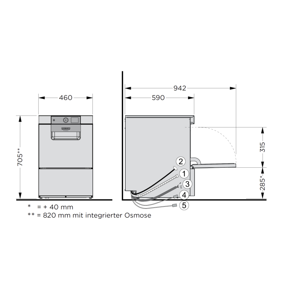 - Abmaße: B 460 x T 590 x H 705 mm (Höhe bei integrierter Osmose 820 mm)