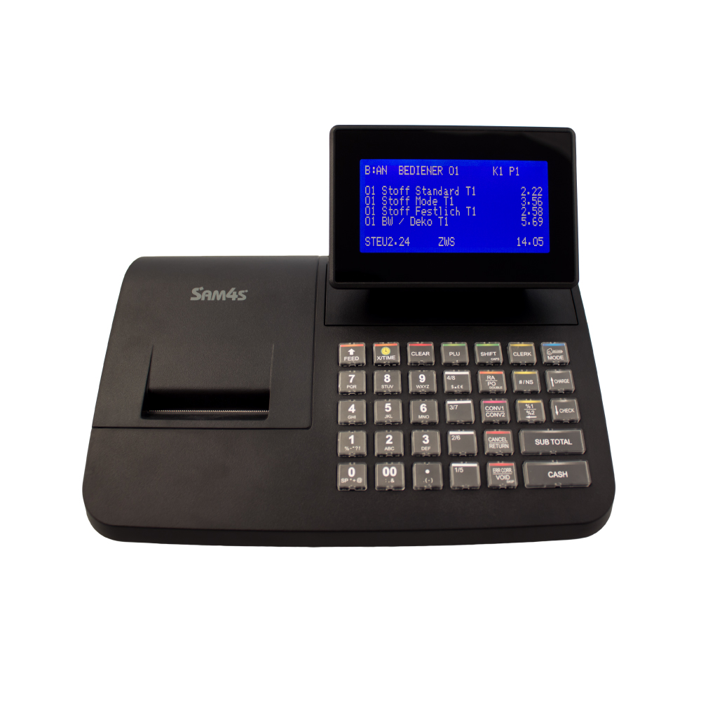 - Maximal 10 Abschlusstasten (Bar, Scheck und 8 Kreditarten)