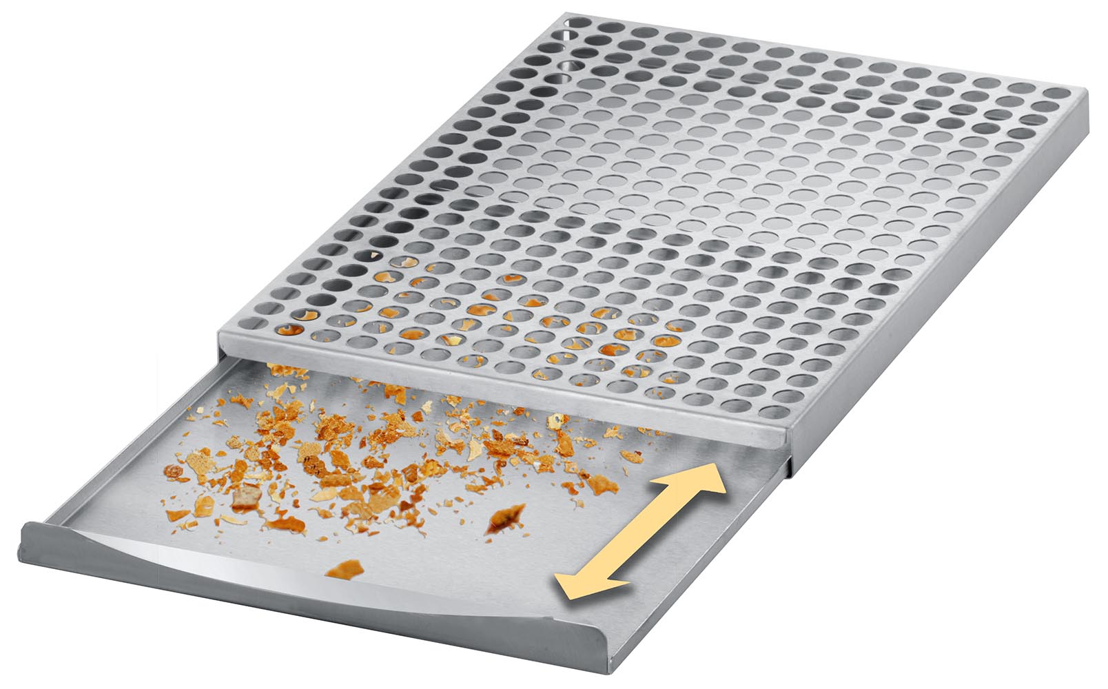 Waffelablage zum Abkühlen und Garnieren der Waffeln. Krümel, Puderzucker etc. fallen in die Krümelschublade!
